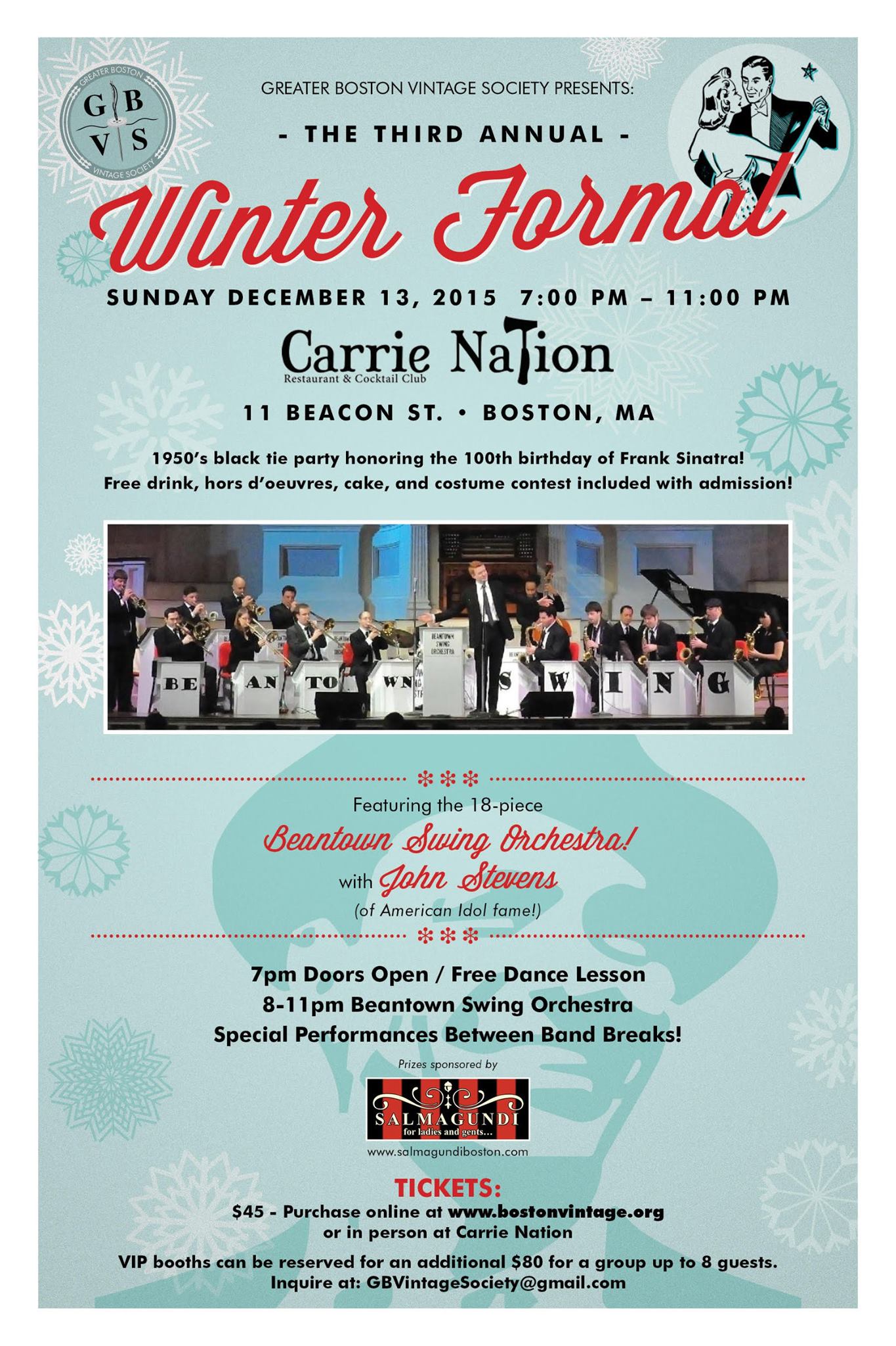 You are invited to attend the WINTER FORMAL, one of Boston’s most spectacular holiday events! This year will take place at the elegant Carrie Nation Restaurant and Cocktail Club in downtown Boston! This 1950’s themed event will bring you back to the glamour and good tidings of holidays past. It will also serve a tribute to two birthdays! The weekend marks the 100th birthday of Frank Sinatra as well as the 2nd year anniversary of the Greater Boston Vintage Society!